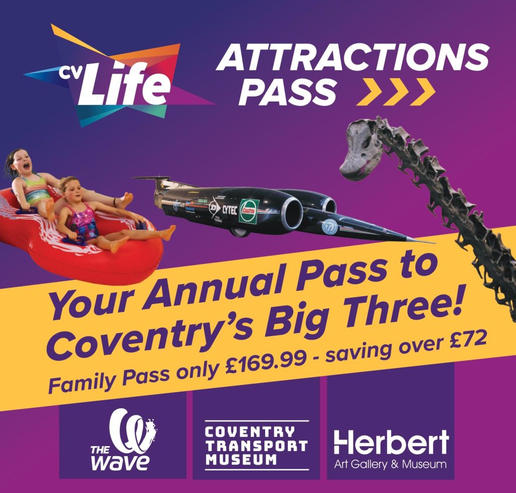 The CV Life Attractions Pass is a multi-venue annual pass. It offers a family of four incredible access to Coventry’s Big Three venues: The Wave, Coventry Transport Museum, and the Herbert Art Gallery & Museum.